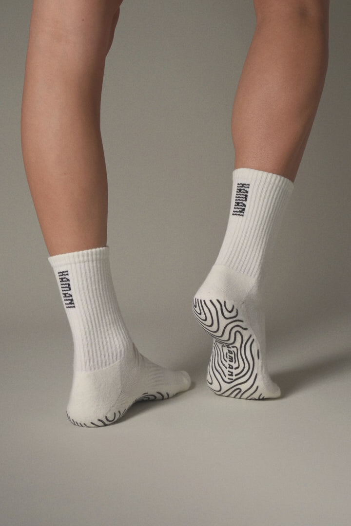 Unsere FLOW Grip Socks in Creme & Schwarz vereinen minimalistisches Design mit maximalem Halt. Das abstrakte Linienmuster symbolisiert Bewegung, Balance und Flow– perfekt für deine nächste Pilates-, Barre- oder Yoga-Session.
