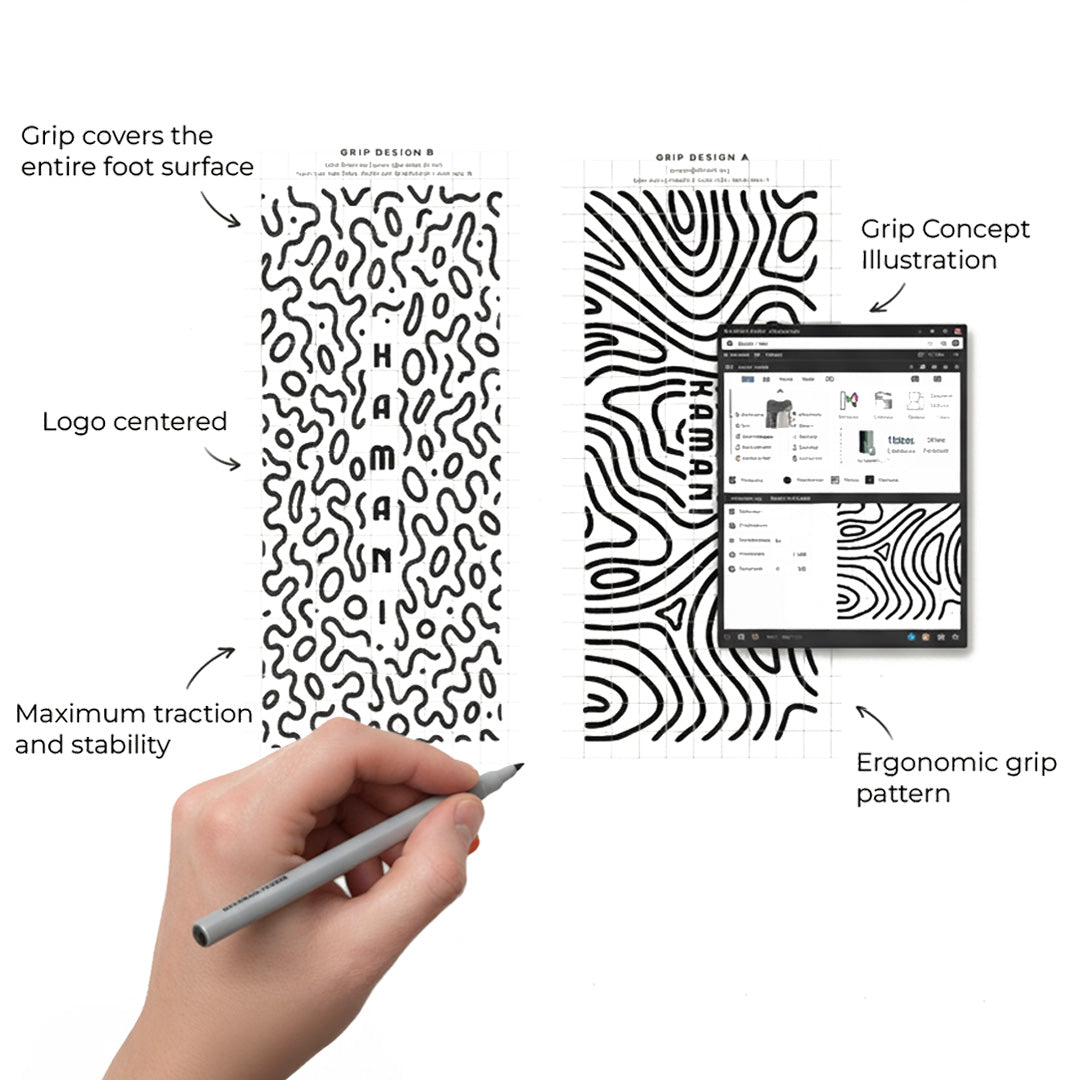 Unsere FLOW Grip Socks in schwarz mit weißen Grip vereinen grafisches Design mit maximalem Halt. Das abstrakte Linienmuster symbolisiert Bewegung und Balance– perfekt für deine nächste Pilates-, Barre-, Yoga- oder Trainingssession.
